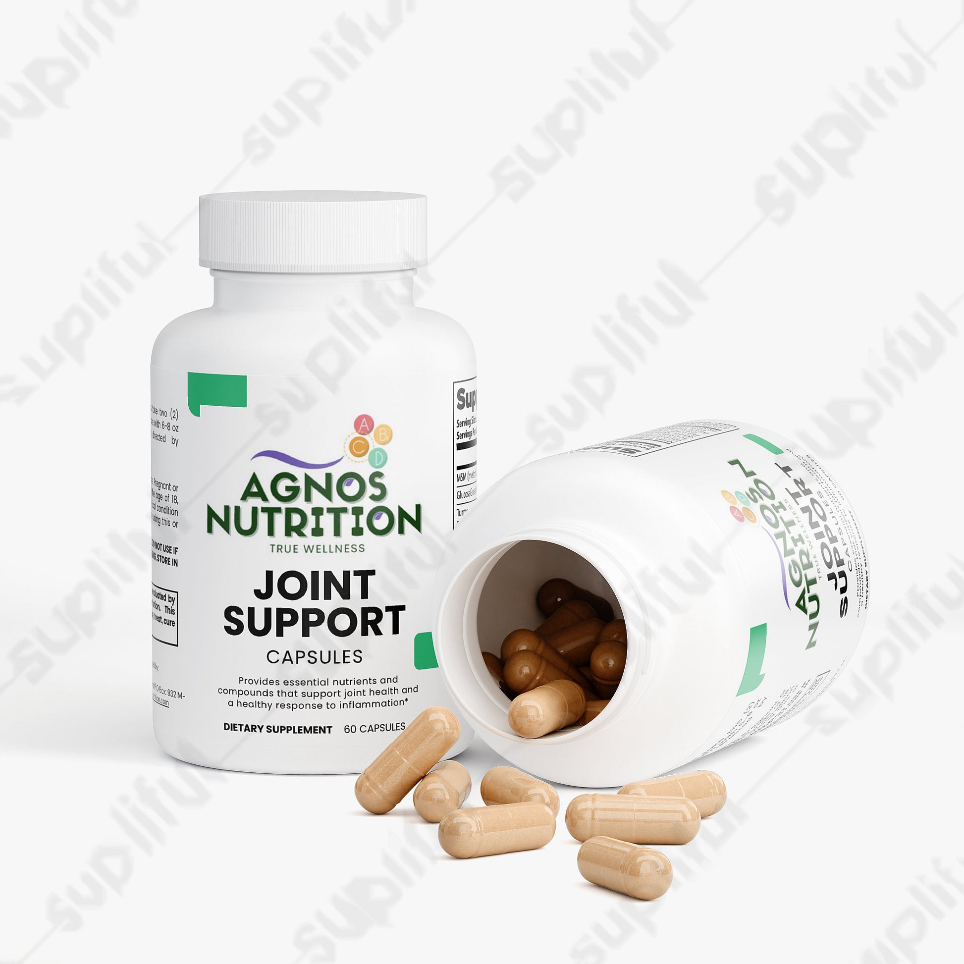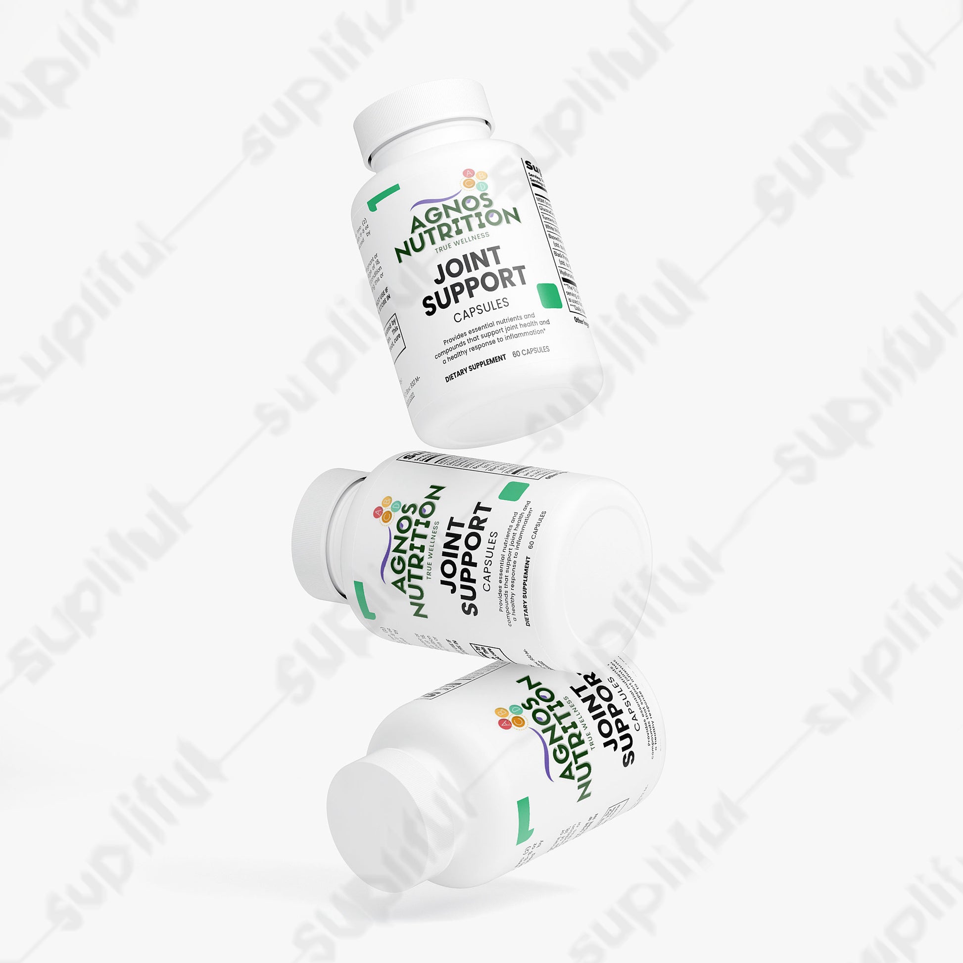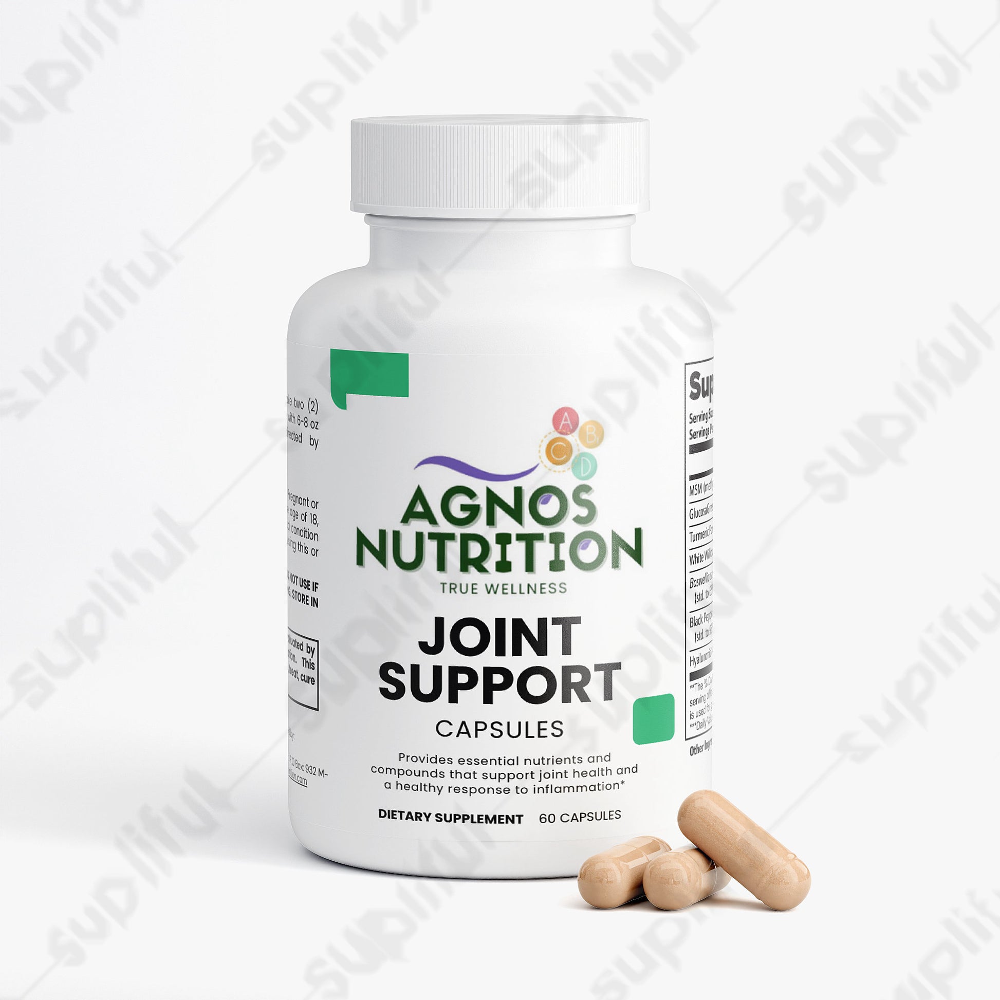 This joint support supplement provides essential nutrients and compounds that support joint health. It features a comprehensive blend of ingredients such as MSM, GlucosaGreen® vegetal glucosamine HCl, Turmeric Powder, and Boswellia serrata Extract, designed to promote joint flexibility, reduce discomfort, and support overall joint function. Ideal for daily consumption, this supplement aims to enhance your joint health through its potent, natural ingredients, without relying on artificial additives.*
