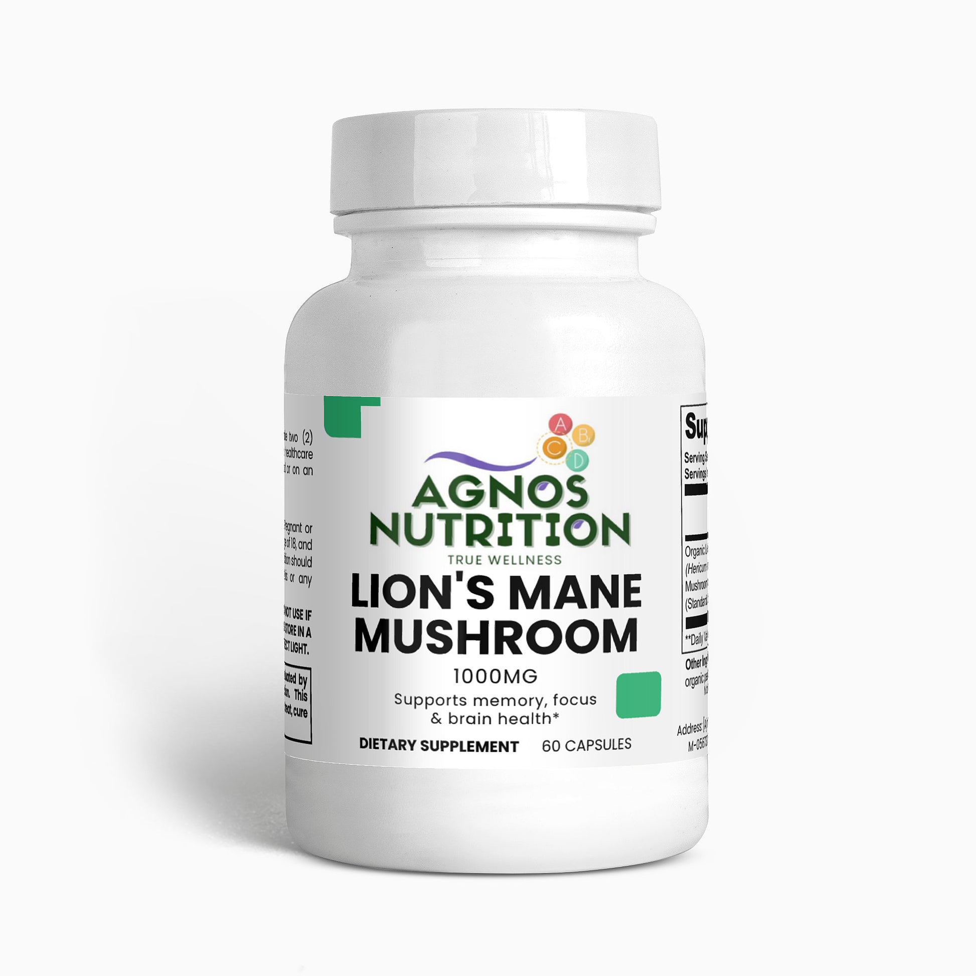 Ingredients: Organic Lion’s Mane (Hericum erinaceus) Mushroom Fruiting Body & Mycelium Powder (Standardized to 40% polysaccharides [400mg]), Organic capsule (pullulan, water), organic pea starch.
